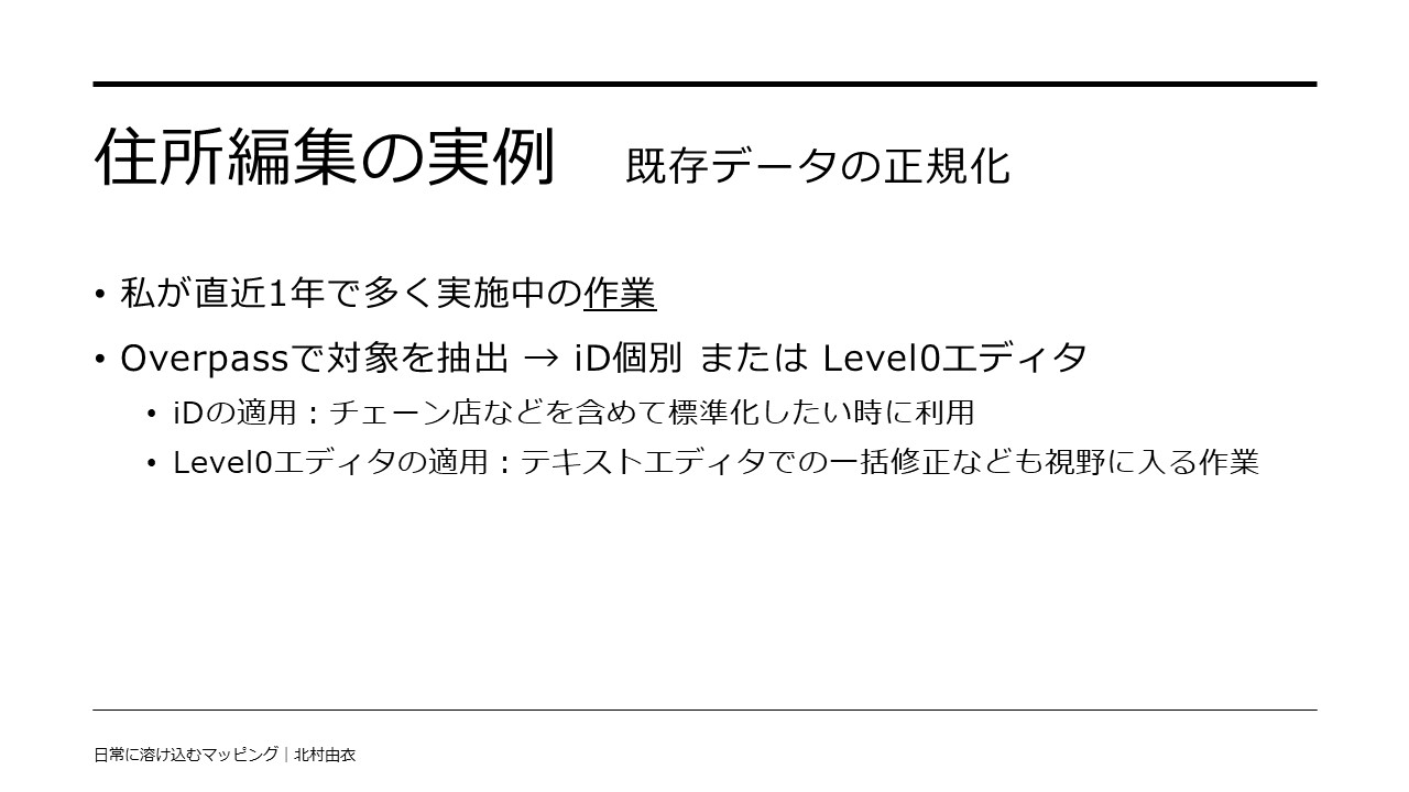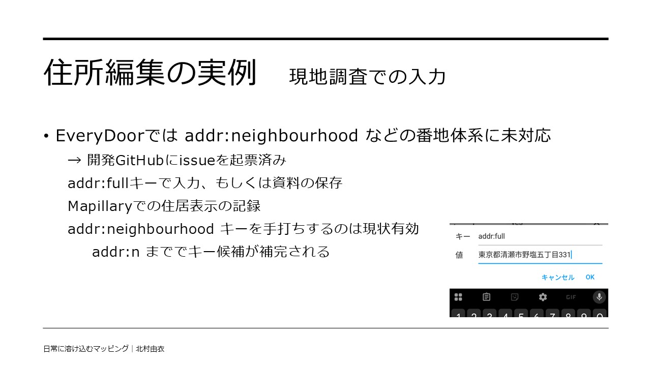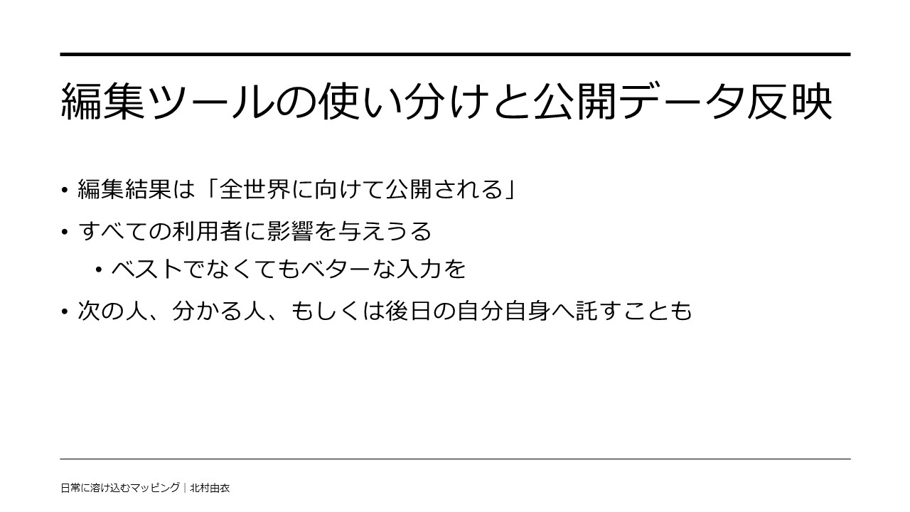 - 後から見返して情報を補うのに使う。EveryDoorでも、publish to OSM のオプションを有効にすることで有効活用可能